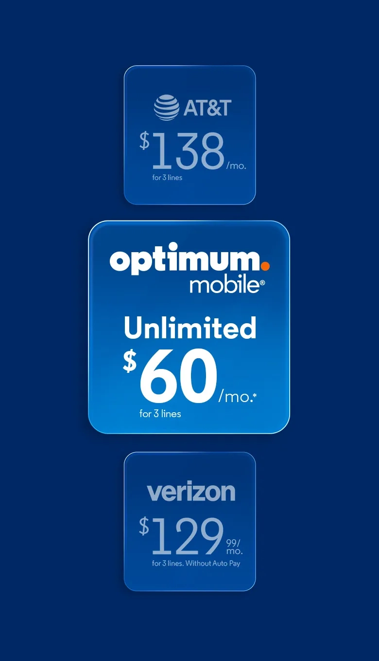 +Savings claim against Verizon based on comparison of 3 lines of service with Optimum Mobile Unlimited plan vs Verizon Unlimited Welcome plan, without Auto Pay, as of 12/11/25. Savings claim against AT&T based on comparison of 3 lines of service with Optimum Mobile Unlimited plan vs AT&T Unlimited Starter plan, with Auto Pay, as of 12/11/25.
