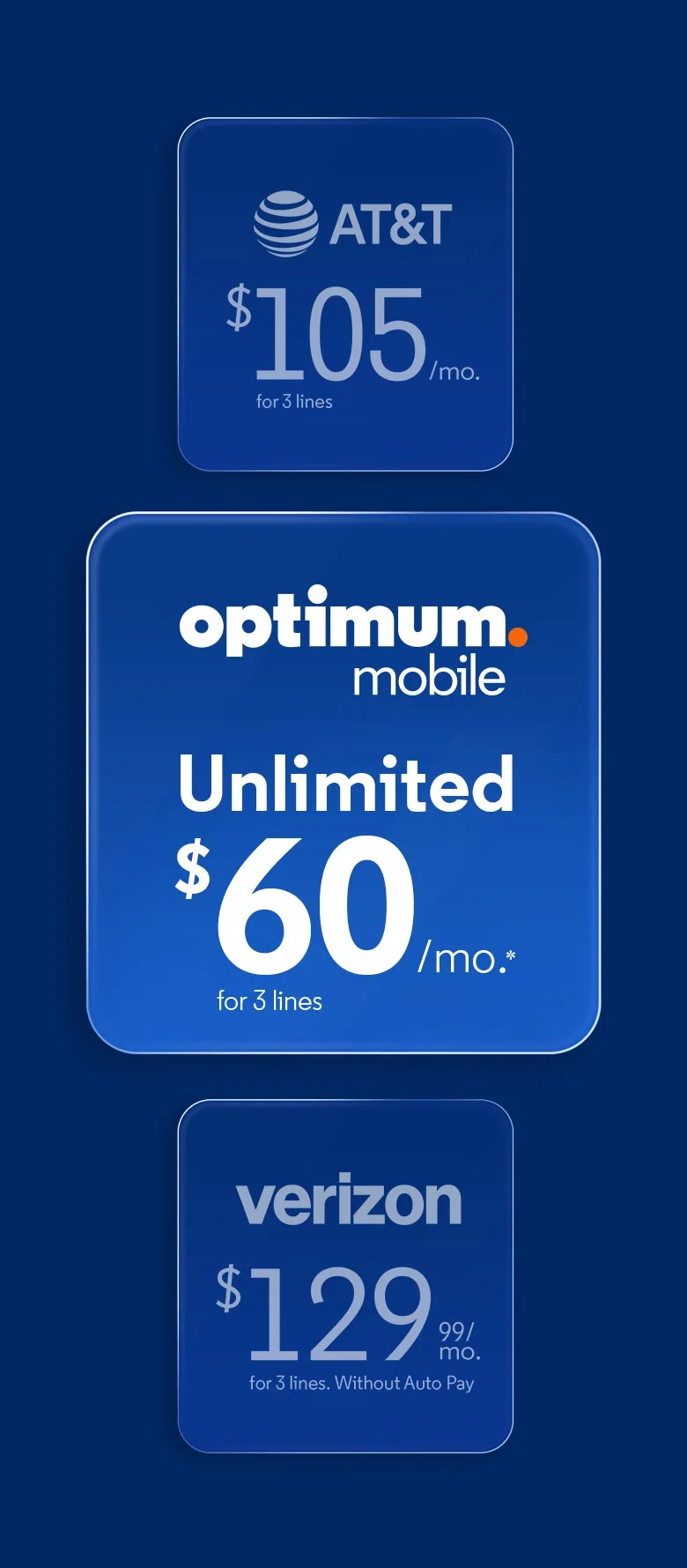 +Savings claim against Verizon based on comparison of 3 lines of service with Optimum Mobile Unlimited plan vs Verizon Unlimited Welcome plan, without Auto Pay, as of 3/12/26. Savings claim against AT&T based on comparison of 3 lines of service with Optimum Mobile Unlimited plan vs AT&T Unlimited Value 2.0 plan, with Auto Pay, as of 3/12/26.